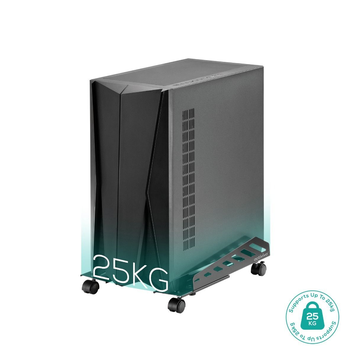 The activiva Heavy-Duty PC Mobile Floor Stand is a versatile solution designed to accommodate large PCs. Constructed from high-quality steel, it offers adjustable width and length, heavy-duty casters with locking mechanisms, and a guardrail design for added security. Its lifting chassis reduces dust and dampness accumulation, ensuring optimal performance and longevity for your PC setup.