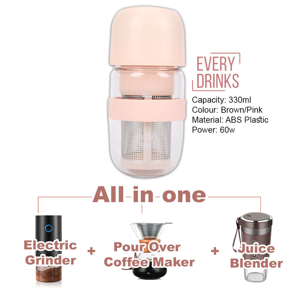 • The coffee grinder ,drip pour over coffee maker juicing cup are 3 in 1,enjoy freshly ground coffee fruit drink anytime, anywhere.