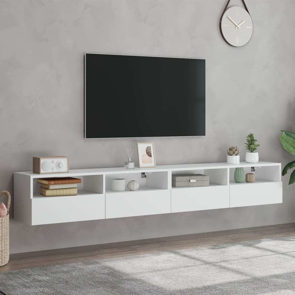 These TV wall cabinets are the perfect solution for your living space to maximise space and keep the floor areas uncluttered. Durable material: The engineered wood is of exceptional quality with a smooth surface and also features strength, stability and resistance to moisture.Ample storage space: The floating TV unit has 2 shelves and 2 compartments behind the door to keep your small items like books, DVDs, and magazines neatly organized and within reach.Wall-mounted design: This wall media unit can be wall-mounted to add extra storage space. That way, you can maximise your floor space and keep the area clean. Good to know:Screws and plugs for inside the wall are not included. We advise to find and use screws and plugs suitable specifically for your walls. If you're not sure, you can consult with a professional. Please read and follow each step of the instructions.